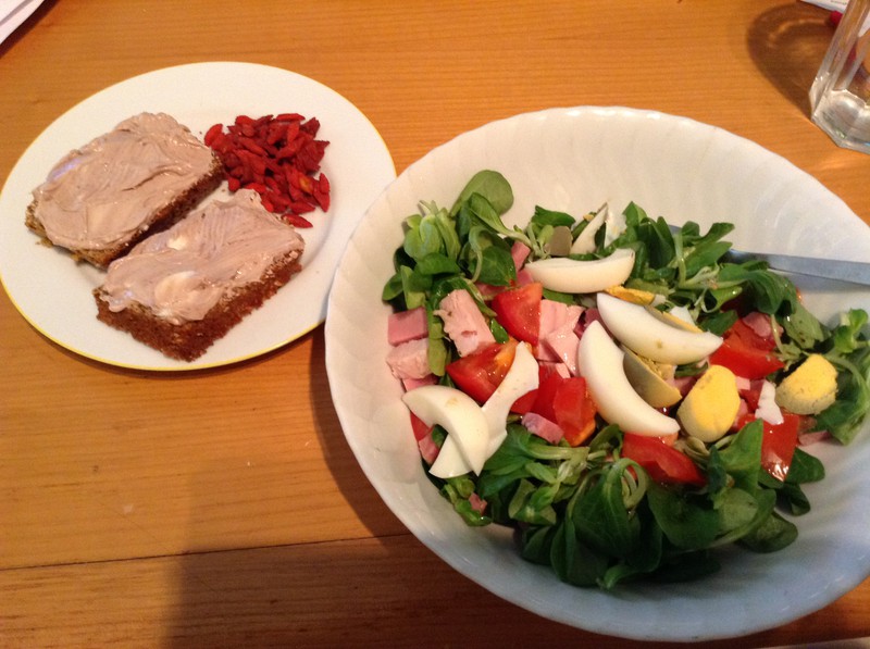 Der heutige Tag begann mit Salat! Hab da noch Putenschinken, ein Ei und eine Tomate reingeschnippselt. Hmmm, und so schön bunt. :)