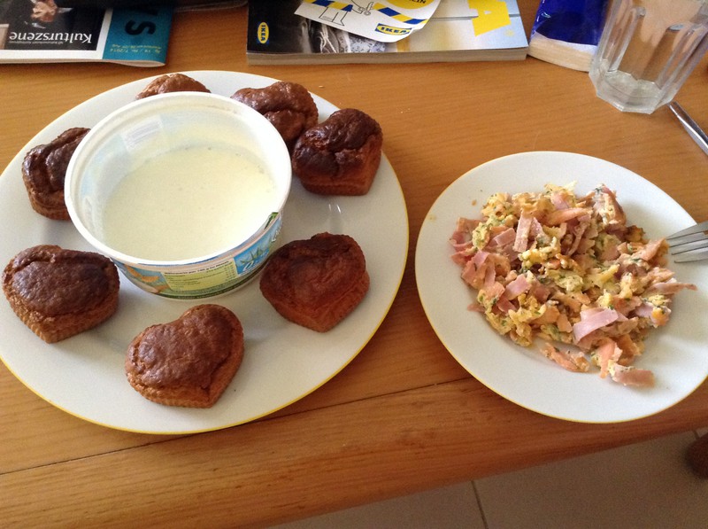 Frühstück begann heute mit Schinken-Lachs-Rührei und den Pfirsichmuffins (mit Haferkleie) und einem Dip aus Quarkcreme.