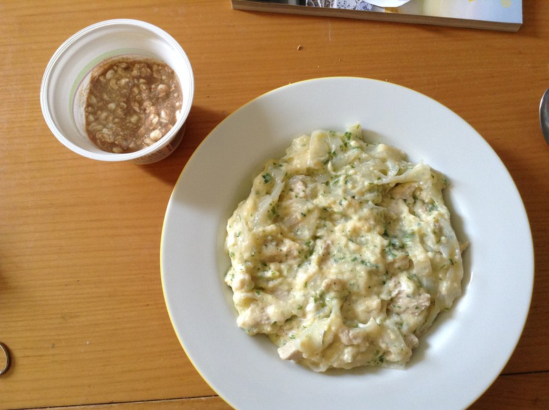 Im Kühlschrank lagerte dann eine ganze Putenbrust, drei Portionen habe ich eingefrorern, mit der vierten wusste ich nicht so recht, was ich anstellen soll. Also habe ich sie spontan zu einem Frikassee mit Shirataki-Bandnudeln verarbeitet.