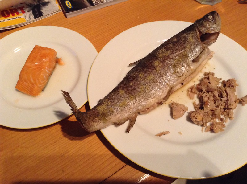 Dafür habe ich mir dann am Abend mal wieder die ultimative Fischbombe gegönnt: Eine Forelle mit Thunfisch (der war mit im Ofen), dazu Stremellachs (der blieb kalt).